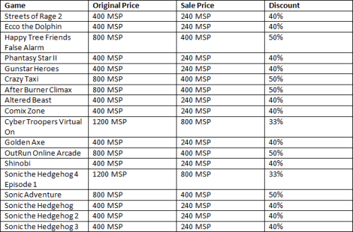 Dopo il salto trovate la lista dei giochi in offerta, tra i tanti vi segnaliamo Streets Of Rage 2, Golden Axe, Sonic 4 Episode 1, Comix Zone, After Burner e Crazy Taxi, acquistabili a prezzi compresi tra 240 e 400 punti Microsoft.