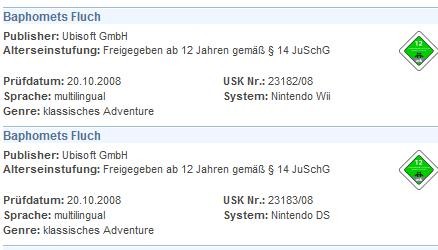 Ebbene, carissimi amici videogiocatori, è con piacere che vi comunichiamo che il mitico George Stobbart sta per tornare su Wii e Nintendo DS. La conferma ufficiale è “trapelata” dal sito dell’USK (istituzione tedesca relativa al rating dei prodotti del mondo videoludico), nel quale sono apparse le voci che potete vedere di seguito:
