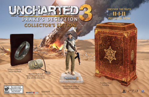 Naughty Dog ha confermato l’esistenza di una limited edition di Uncharted 3, disponibile in America ed Europa dal primo novembre. La versione da collezione del gioco conterrà il disco racchiuso in una speciale custodia metallica, una statuetta di Nathan e le repliche (indossabili) del ciondolo e del bracciale usati da Drake.