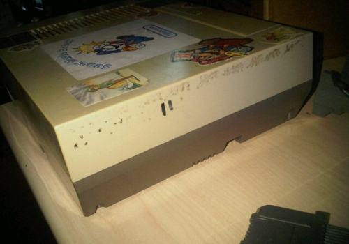 La console appare ovviamente ingiallita (perfettamente normale, per una console con 25 anni alle spalle), da notare i simpatici adesivi di Super Mario e link applicati sulla parte superiore. Su un lato, come potete vedere dalla foto sopra, sono presenti delle tacche disegnate col pennarello, ormai parzialmente scolorite. A cosa servivano? Semplice, per indicare il numero di giochi finiti. Ben 60, secondo le parole di Cliffy, compreso Ghouls ‘n Ghosts, davvero difficilissimo nella sua versione per Nintendo NES.