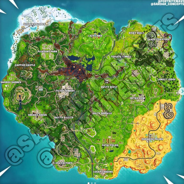 Detto ciò, ormai tutti si stanno ora chiedendo come sarà la nuova mappa di Fortnite. Un fan, su Instagram, ha pubblicato un concept decisamente interessante (che troverete in basso). Spiccano, ad esempio, i due nuovi punti d’interesse e un nuovo terreno su cui svolgere i combattimenti. Dicevamo dei punti d’interesse: sono stati chiamati Crazy Coasters e Slippey Slopes, aree situate a Nord Est e a Nord Ovest della mappa. Il primo è un parco divertimenti dove ci si potrà ovviamente sbizzarrire, mentre il secondo sarà ambientato in aree innevate in paesaggi montuosi. Vedremo se questo designer ci sarà andato quantomeno vicino…